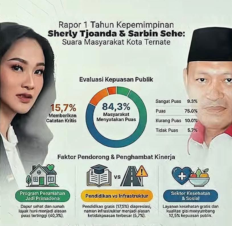 MALUKU UTARA – Tingkat kepuasan masyarakat terhadap satu tahun kepemimpinan Gubernur dan Wakil Gubernur Maluku Utara, Sherly Tjoanda dan Sarbin Sehe, menunjukkan tren positif. Hasil evaluasi mencatat sebanyak 84,3 persen masyarakat menyatakan puas terhadap kinerja pemerintah provinsi.