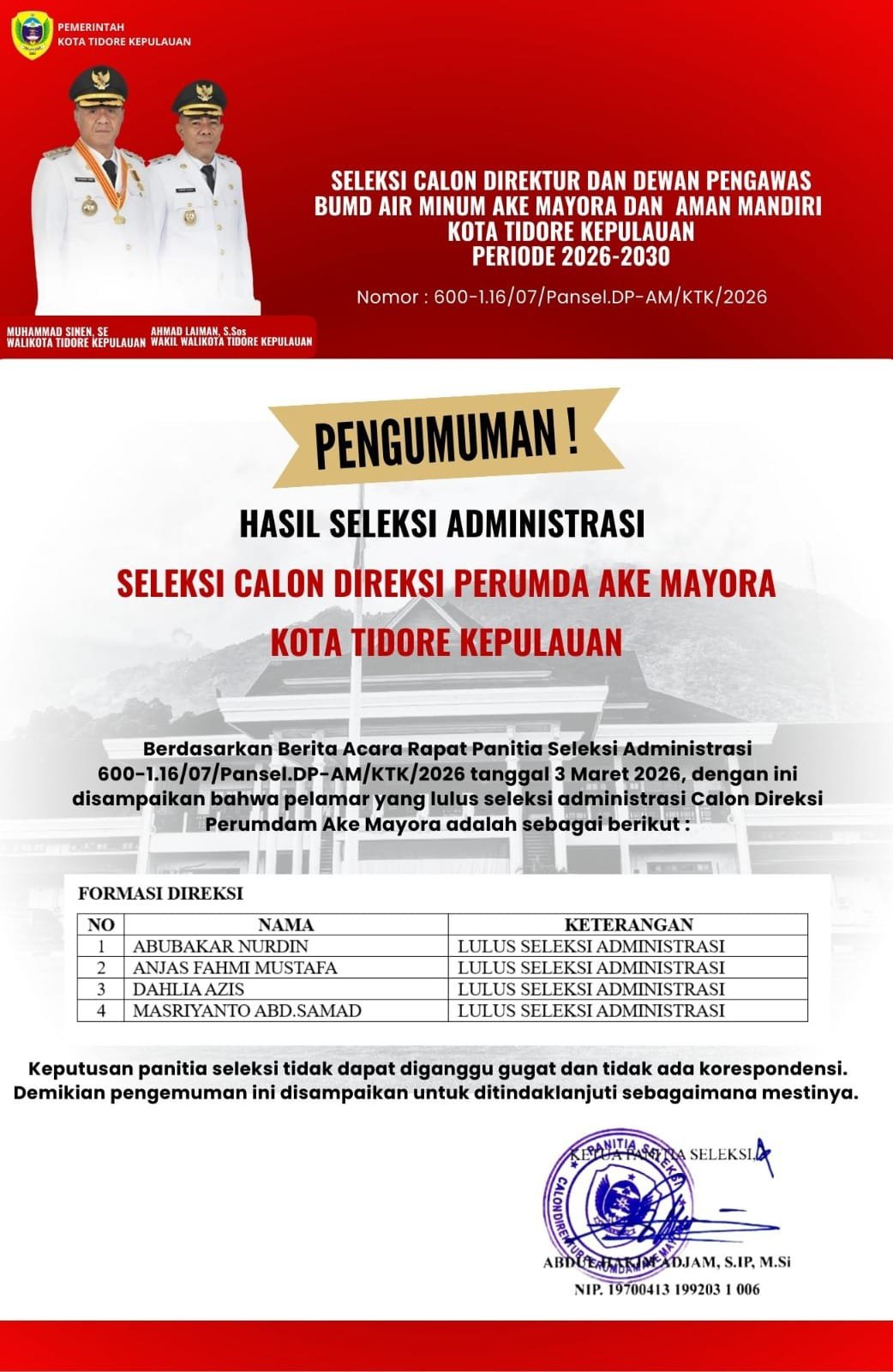 TIDORE KEPULAUAN, 3 Maret 2026 – Panitia Seleksi (Pansel) Calon Direksi Perusahaan Umum Daerah (Perumda) Air Minum Ake Mayora Kota Tidore Kepulauan mengumumkan hasil seleksi administrasi untuk periode 2026–2030. Pengumuman ini tertuang dalam Berita Acara Rapat Pansel bernomor 600-1.16/07/Pansel.DP-AM/KTK/2026.