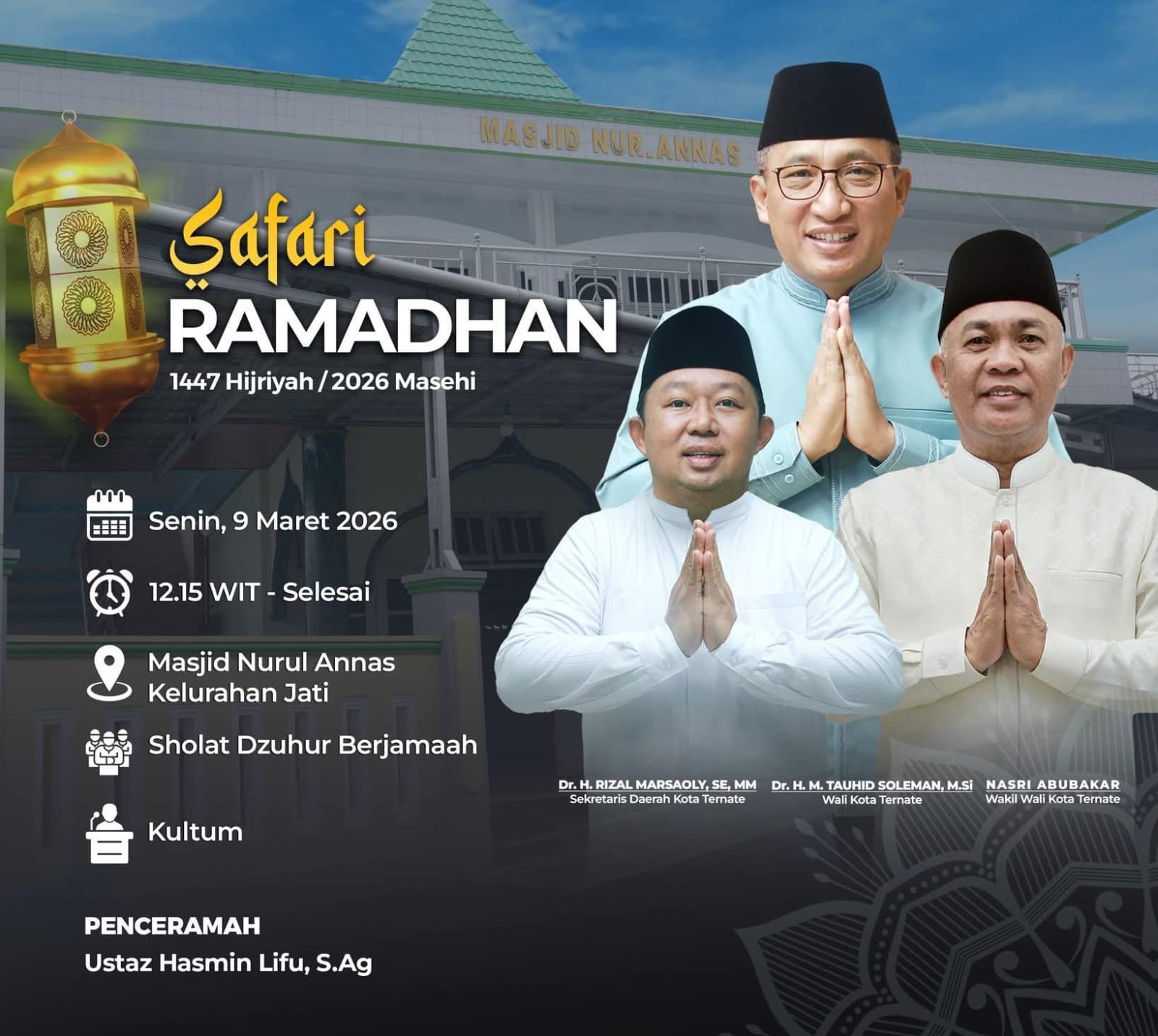 Kegiatan Safari Ramadan tersebut dijadwalkan berlangsung pada Senin, 9 Maret 2026, pukul 12.15 WIT, bertempat di Masjid Nurul Annas, Kelurahan Jati, Kota Ternate.